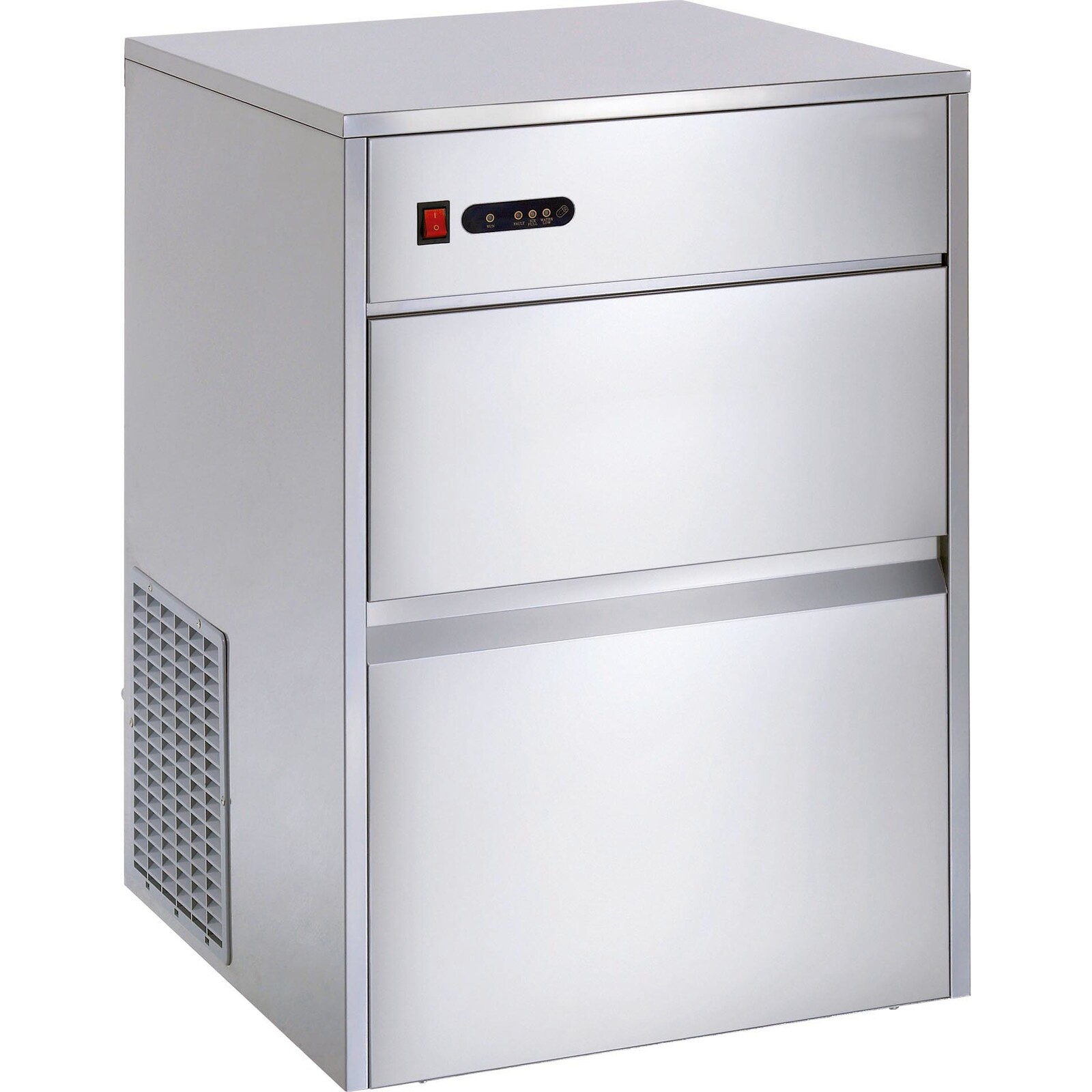 Edelstahl. Ausführung Eiswürfel: Kegelform (Hohlkegel). Produktion max. 25 kg/24 Std. Der Vorratsbehälter umfasst ca. 7 kg. Durch die Luftkühlung halten Sie bitte zu allen Seiten einen Abstand von ca. 10 cm! Gewicht: 30kg. Festwasseranschluss 3/4 Zoll, Wasserablauf Ø 21 mm. Kühlmittel R290.