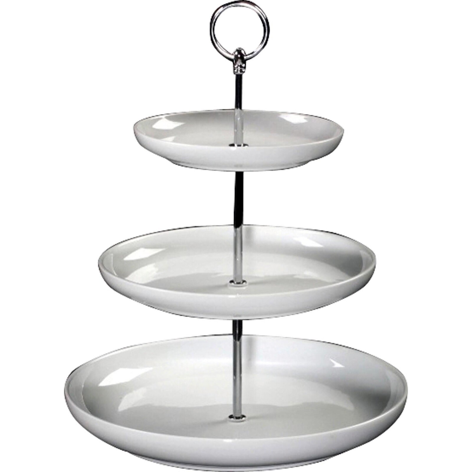 Porzellan, Edelstahl Oberfläche verchromt. Ø Etagen (27,5 cm, 21,5 cm, 16,5 cm).