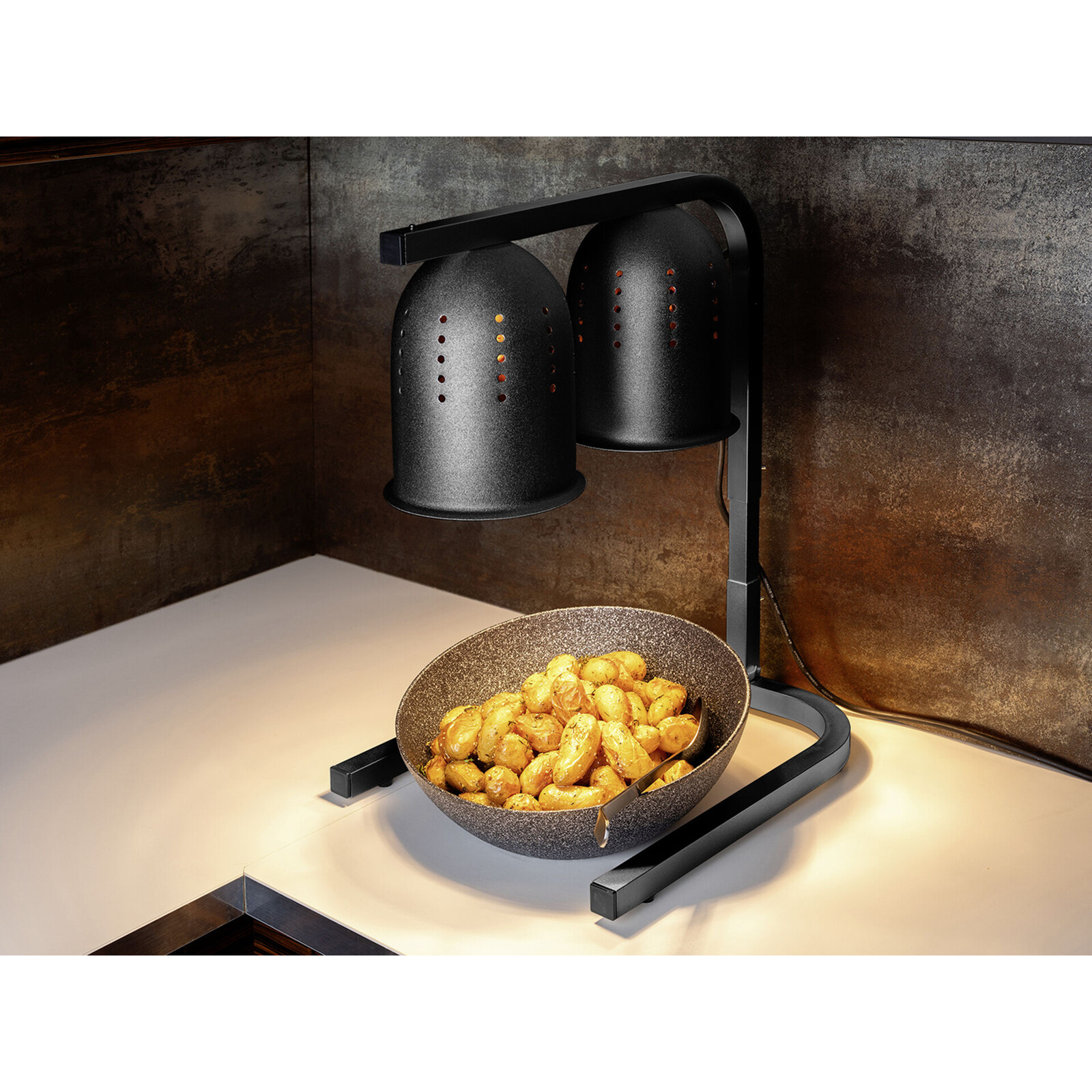 Wärmebrücke mit zwei Infrarotlampen. Fassung E27. Lichtfarbe: warmweiß. Wärmelampe höhenverstellbar von 58cm bis 77,5cm. Kabellänge 1,5m. Edelstahl, schwarz.