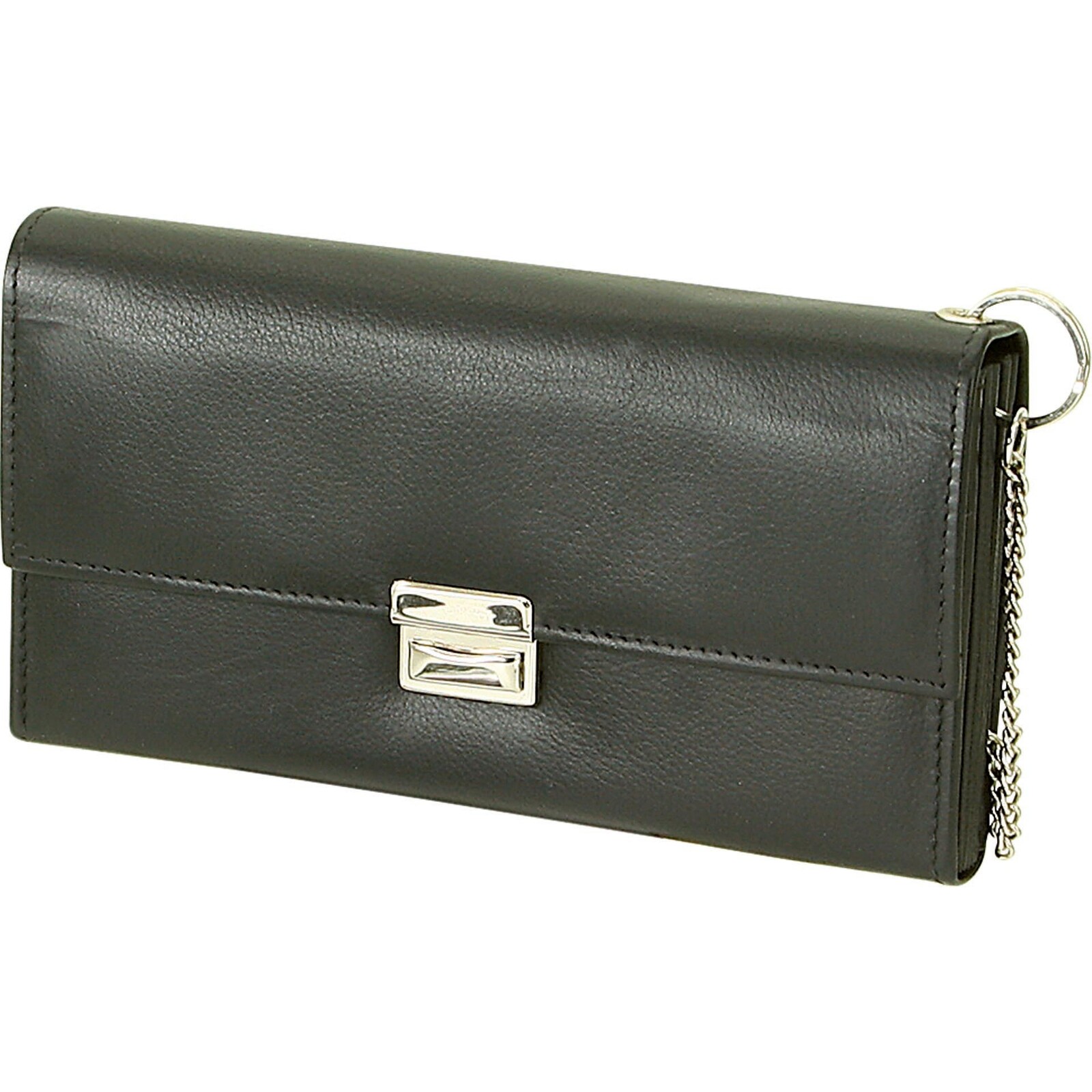 Nappa-Leder schwarz. Schlüsselkette mit Karabinerhaken. Bestehend aus: 1x Münzfach, 5x Scheinfach, 1x schmales Scheinfach, 1x Reißverschlussfach, 1x Steckfach an der Rückseite.