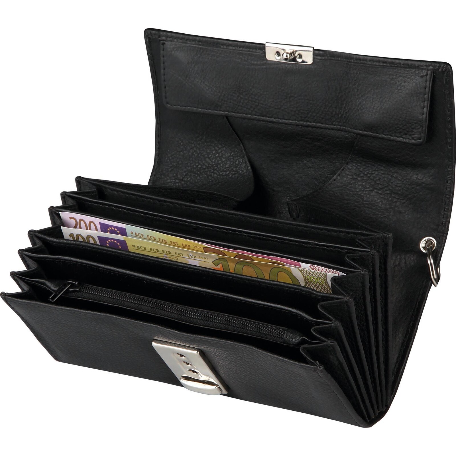 Kalbsnappaleder schwarz, hohe Qualität. Schlüsselkette mit Karabinerhaken. Münzfach mit Leder abgefüttert. Bestehend aus: 1x Münzfach, 5x Scheinfach, 1x schmales Scheinfach, 1x Reißverschlussfach, 1x Steckfach an der Rückseite. Weiche Haptik.