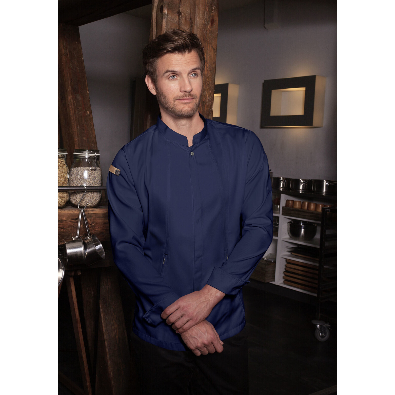 Farbe: stahlblau. Vorderteil 65 % Polyester (recycelt), 35 % Baumwolle, Rückseite 100 % Polyester. Innovative nachhaltige Kochjacke, die urbanen Style mit natürlichem Flair verbindet. Polyesteranteil aus recyceltem Plastik, leicht tailliert geschnitten, Rückeneinsatz aus Jersey Pique sorgt für angenehme Belüftung und erhöhte Bewegungsfreiheit, mit Druckknöpfen zum schnellen Öffnen und Schließen, Ärmelmanschetten mit Druckknöpfen, Vorderteil mit Reißverschlusstaschen und Leistentasche am linken Ärmel, stylische Applikationen aus Kontrastbändern an den Ärmeln und im Nacken für eine urbane Optik.