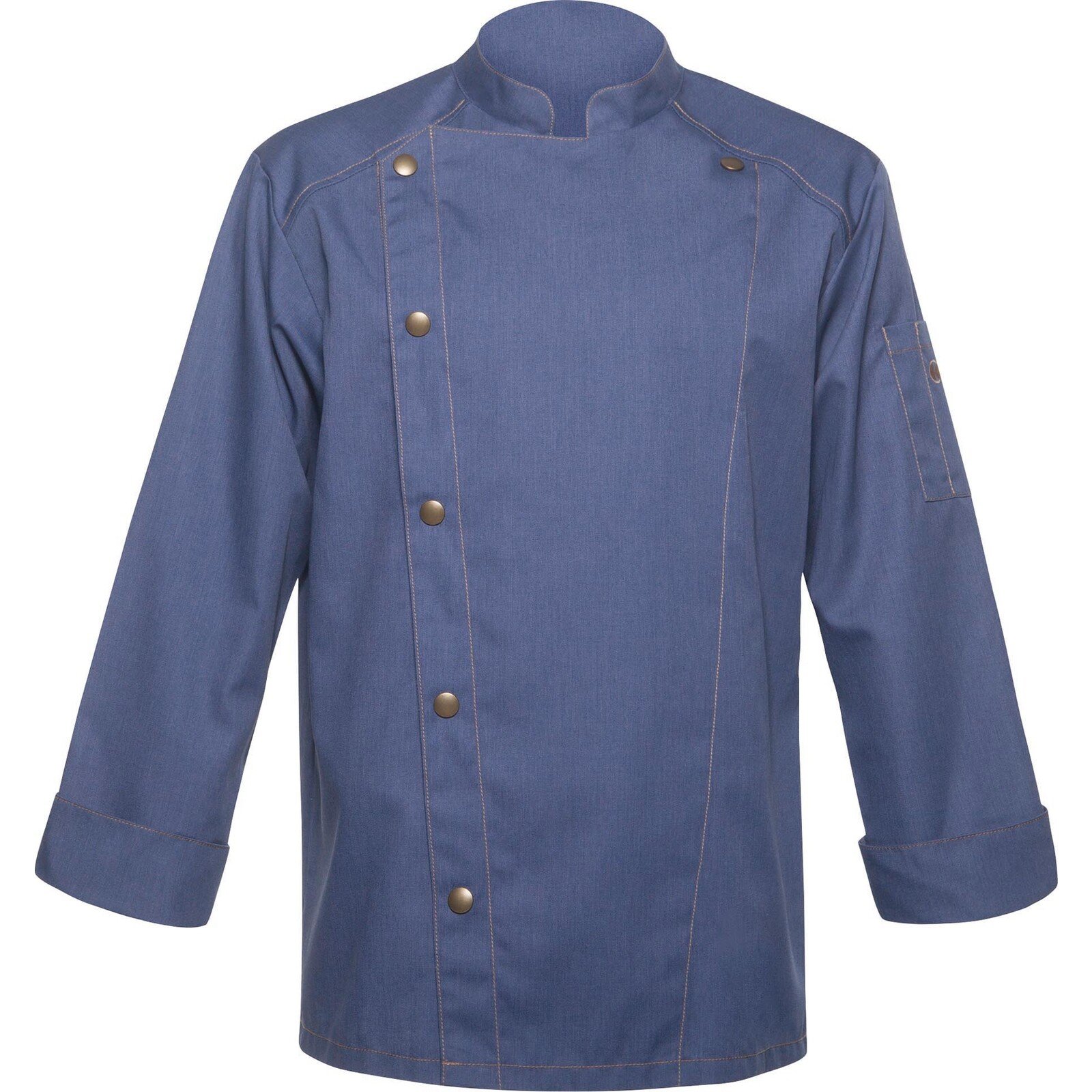 Farbe: Vintage blue. Trendige Kochjacke in Jeans-Optik mit schlanker Silhouette. Kontrastfarbige Steppnähte für den originalen Jeans-Look. Asymmetrisch geschlossene, einreihige 5-Knopf-Jacke mit Druckknöpfen zum schnellen Öffnen und Schließen. Ärmelmanschetten mit Schlitz. Aufgesetzte Ärmeltasche links mit praktischem Stiftfach. Industriewäschetauglich (95°C). 65% Polyester/ 35% Baumwolle. Köpergewebe, 195 g/m². Hochveredelt, gekrumpft, waschecht, pflegeleicht.