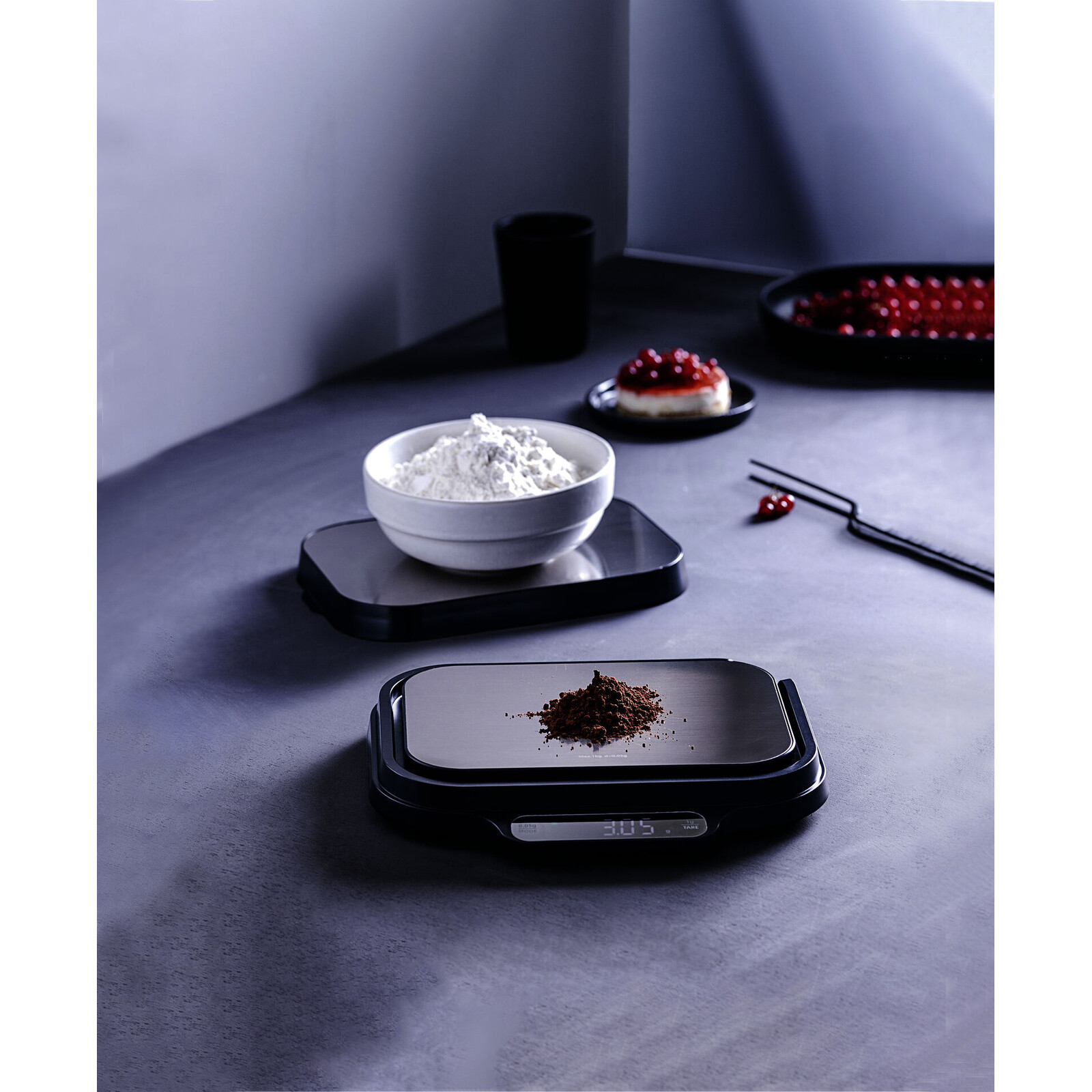 Mit doppelter Wiegefläche. 2 x Wiegeflächen: 1 x bis 15 kg (1g) ist abnehmbar und 1 x bis 1 kg (0,05 g). Maße der Wiegeflächen: 22 x 16 cm und 19,5 x 13,5 cm. Enthält hochpräzise DMS-Sensoren. Messwerte auf Display gut lesbar dank Hintergrundbeleuchtung. Ein/Aus von Hand. Abschaltautomatik. Tarafunktion. Einheiten: g (kg)/oz/ml. Anzeige für schwache Batterie. Stromversorgung: 3 x 1,5 AAA-Batterien, im Lieferumfang enthalten.