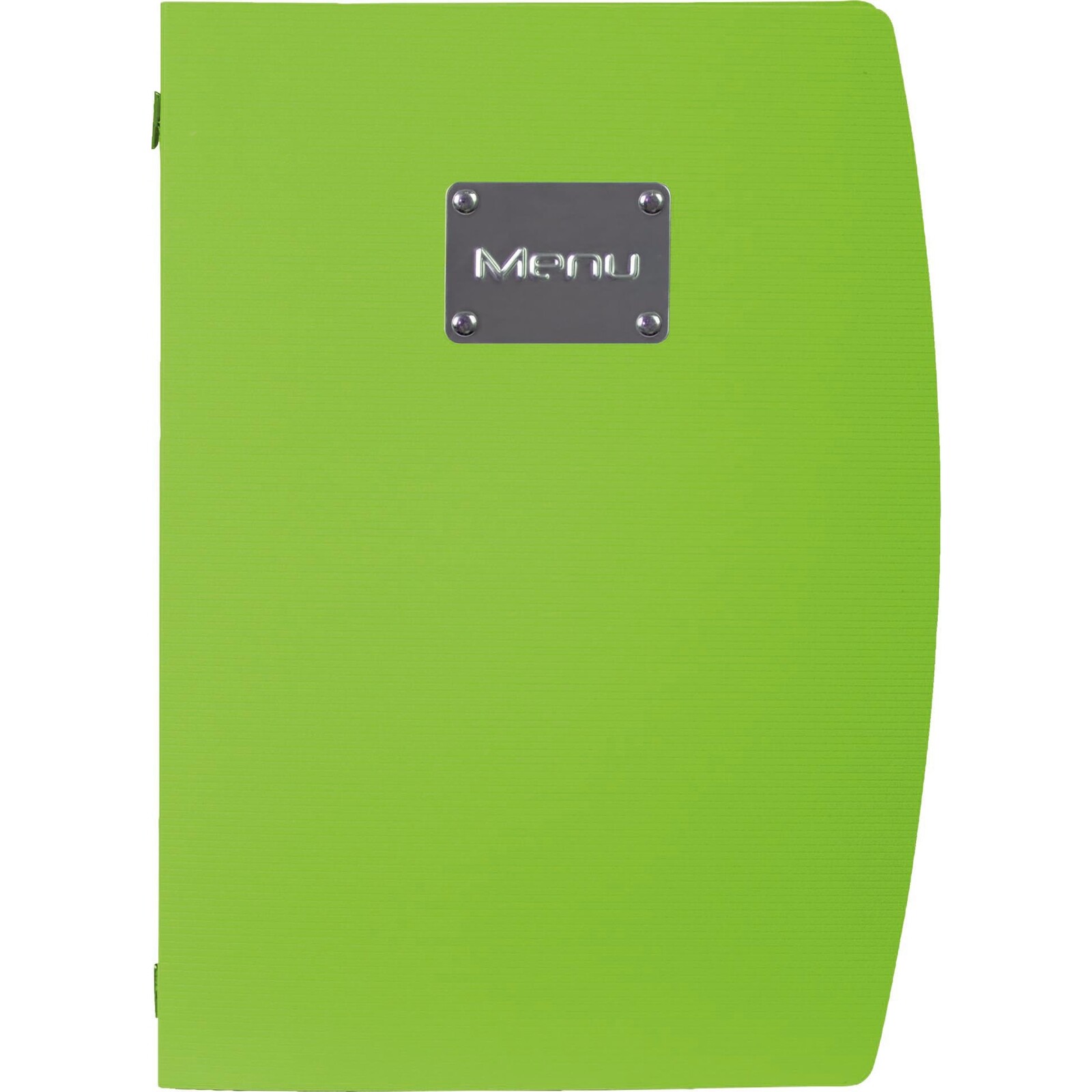 Moderne Strukturkarte aus Kunststoff (PP). Edelstahlschild mit Aufdruck „Menu“, inkl. 1 Doppeleinlage. Für bis zu 10 Einleger geeignet. Heftung: Gummiband mit Doppeleinlage (4 Seiten). Leicht zu reinigen.
