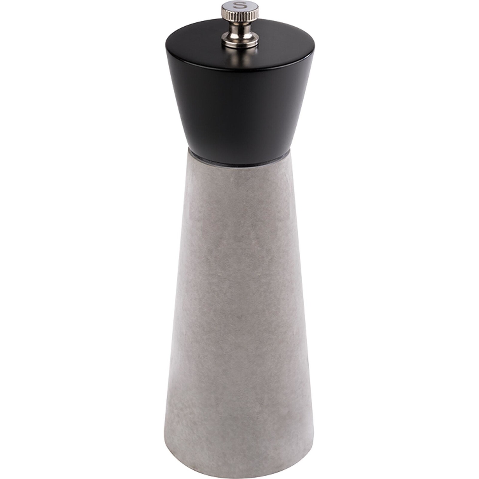 Korpus aus Beton, Kopf aus Buchenholz gefertigt. Stufenlos einstellbarer Mahlgrad. Ø 6,0 x Höhe: 18,0 cm. Nicht spülmaschinengeeignet. Farbe: grau/ schwarz.