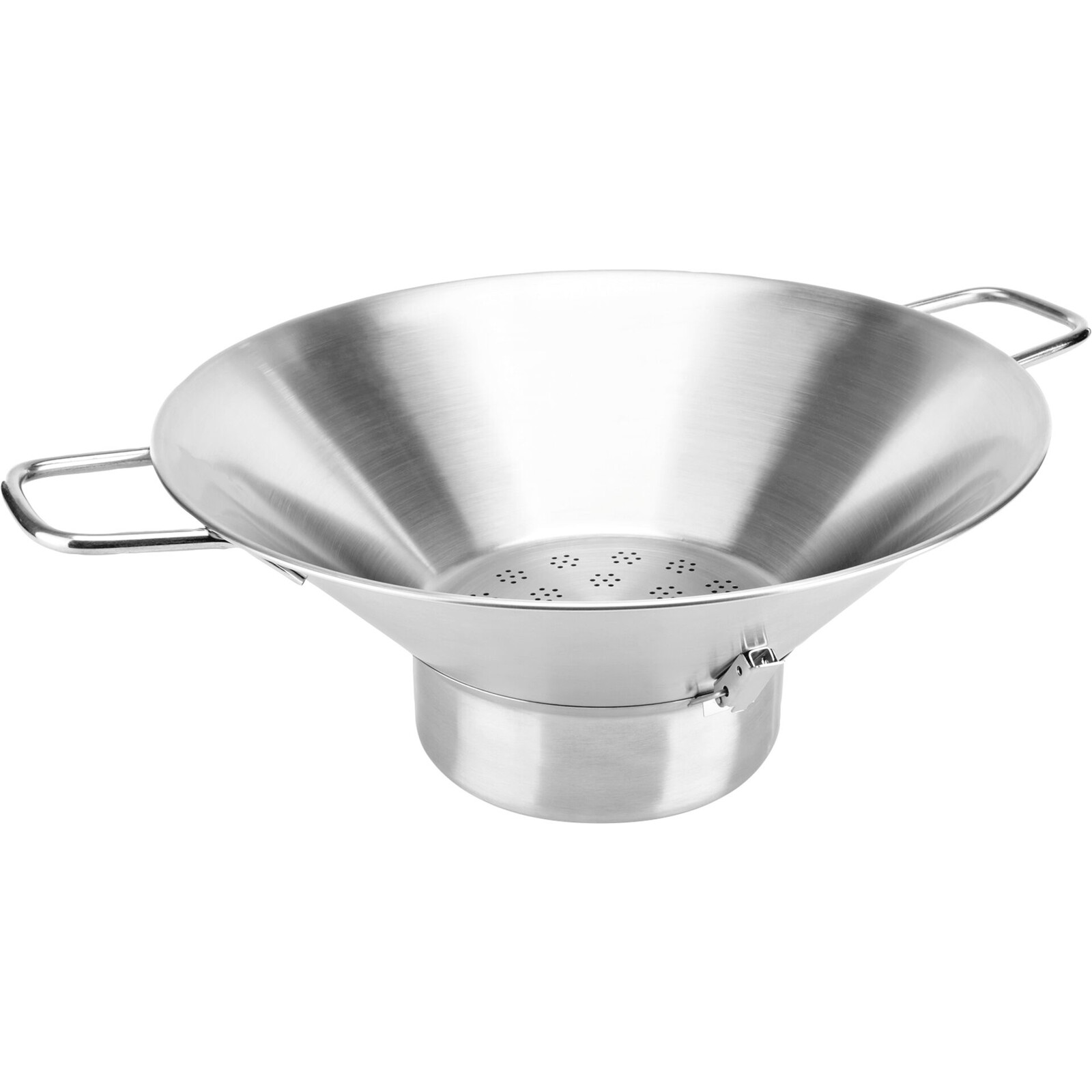 Seiher aus 18/10 Edelstahl mit Seitengriffen und abnehmbarer Abtropfschale. Maße: Ø 40cm, H 20cm.