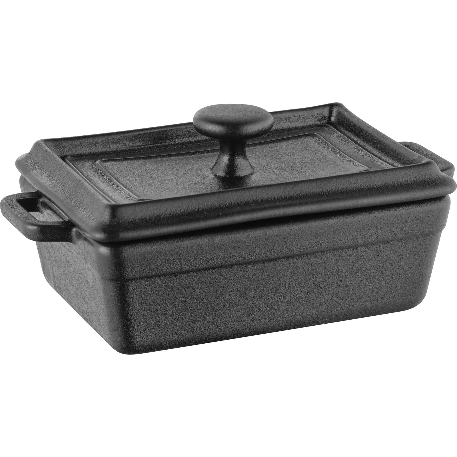Porzellan. Optik wie Gusseisen. Farbe schwarz. Backofenfest bis 220°C. Spülmaschinengeeignet. Mischsortierung.