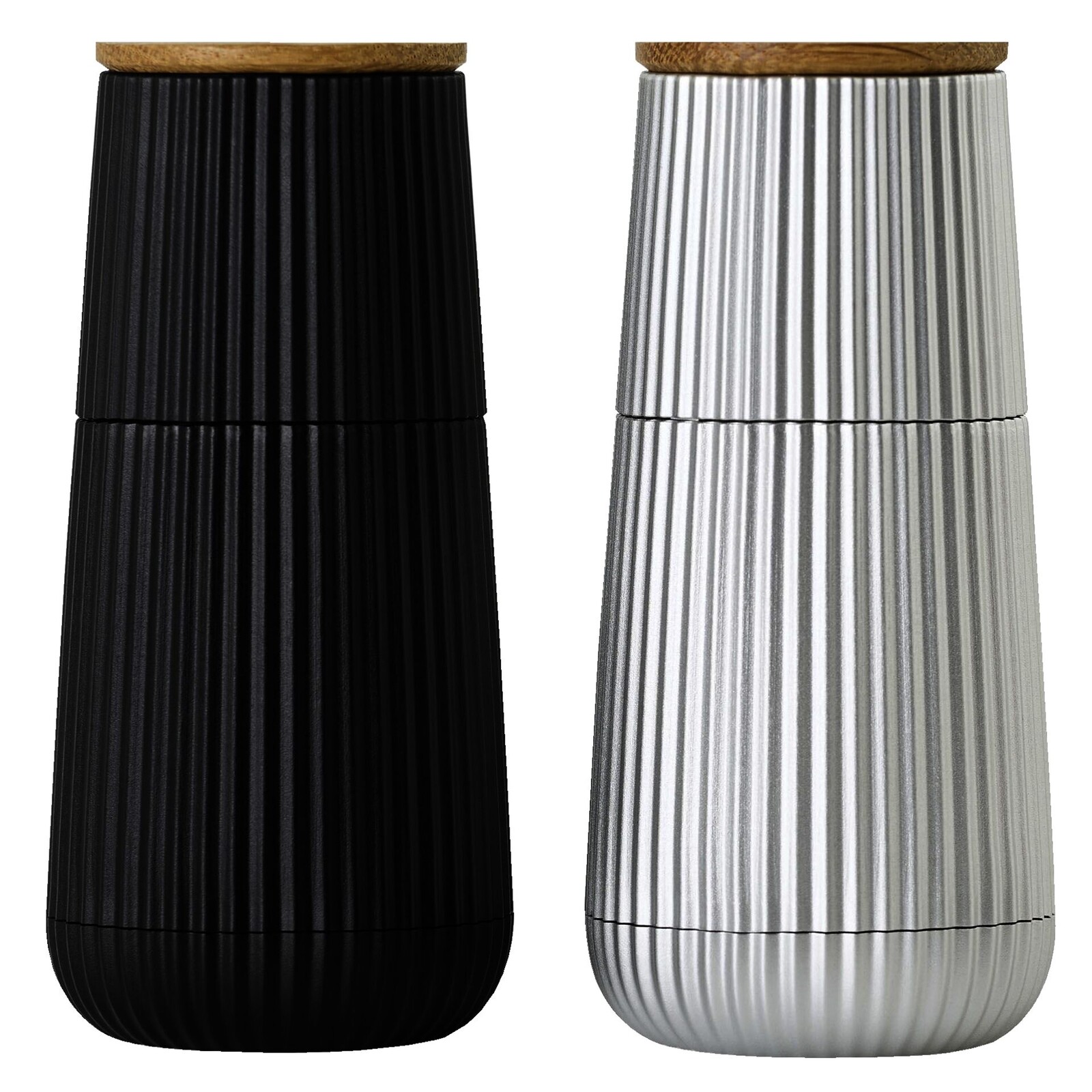 Mühlen-Set mit Kunststoffgehäuse und Eichenholz-Aromaschutzkappe. Hochleistungs-Ceramic Mahlwerk CeraCut ®. Stufenlose Mahlgradeinstellung. Pro Verpackung 1x schwarze Mühle, 1x silberne Mühle, mit je 1x Eichenholzdeckel. Nicht spülmaschinengeeignet.