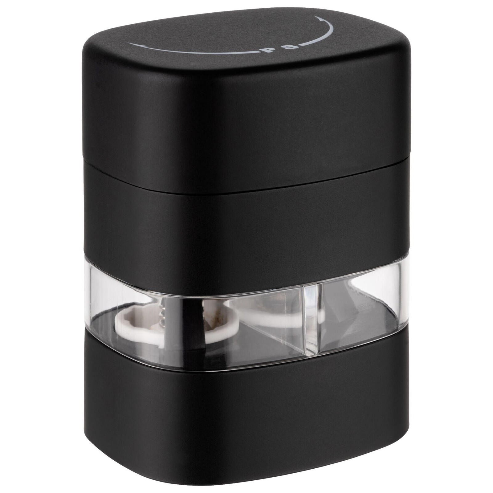 Salz- und Pfeffermühle in Einem. Gefertigt aus ABS/Acryl mit einem Mahlwerk aus Keramik, bei dem der Mahlgrad einstellbar ist. Nicht spülmaschinengeeignet!