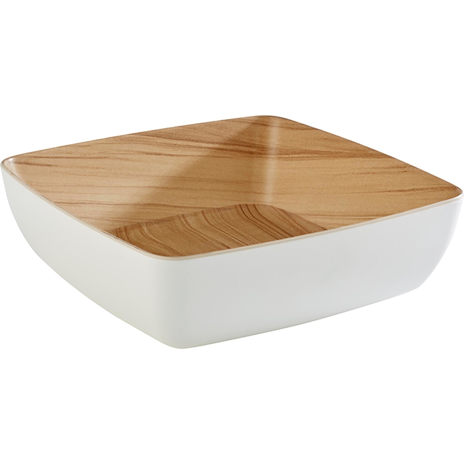 Melamin. Matte Oberfläche in Holzoptik innen und weiß außen. Stapelbar und spülmaschinengeeignet.