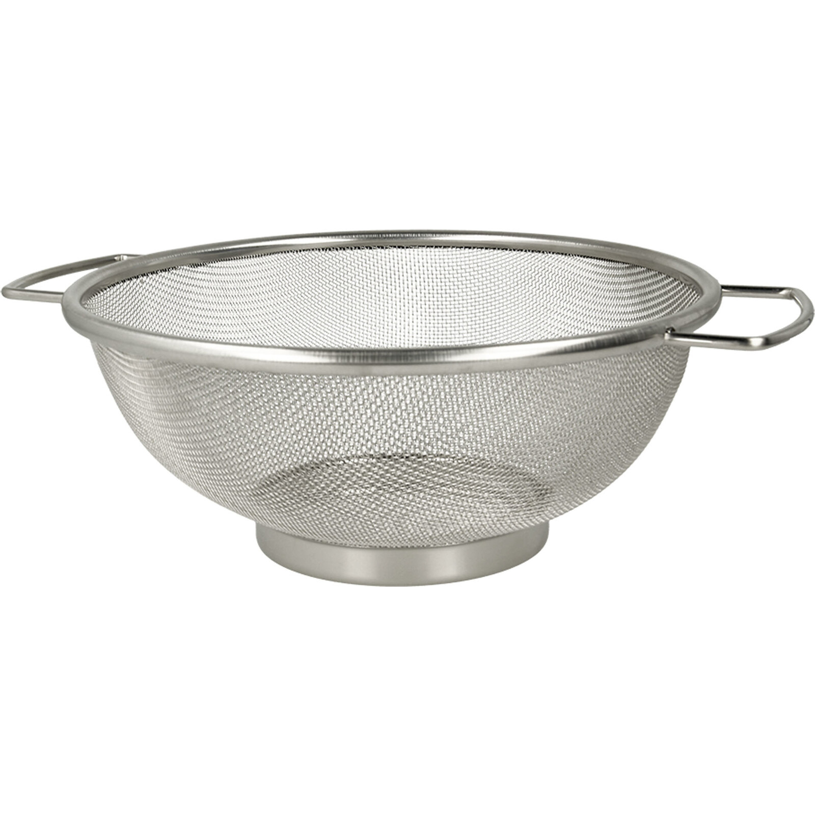 Sicher stehendes Edelstahlsieb mit festen Griffen.