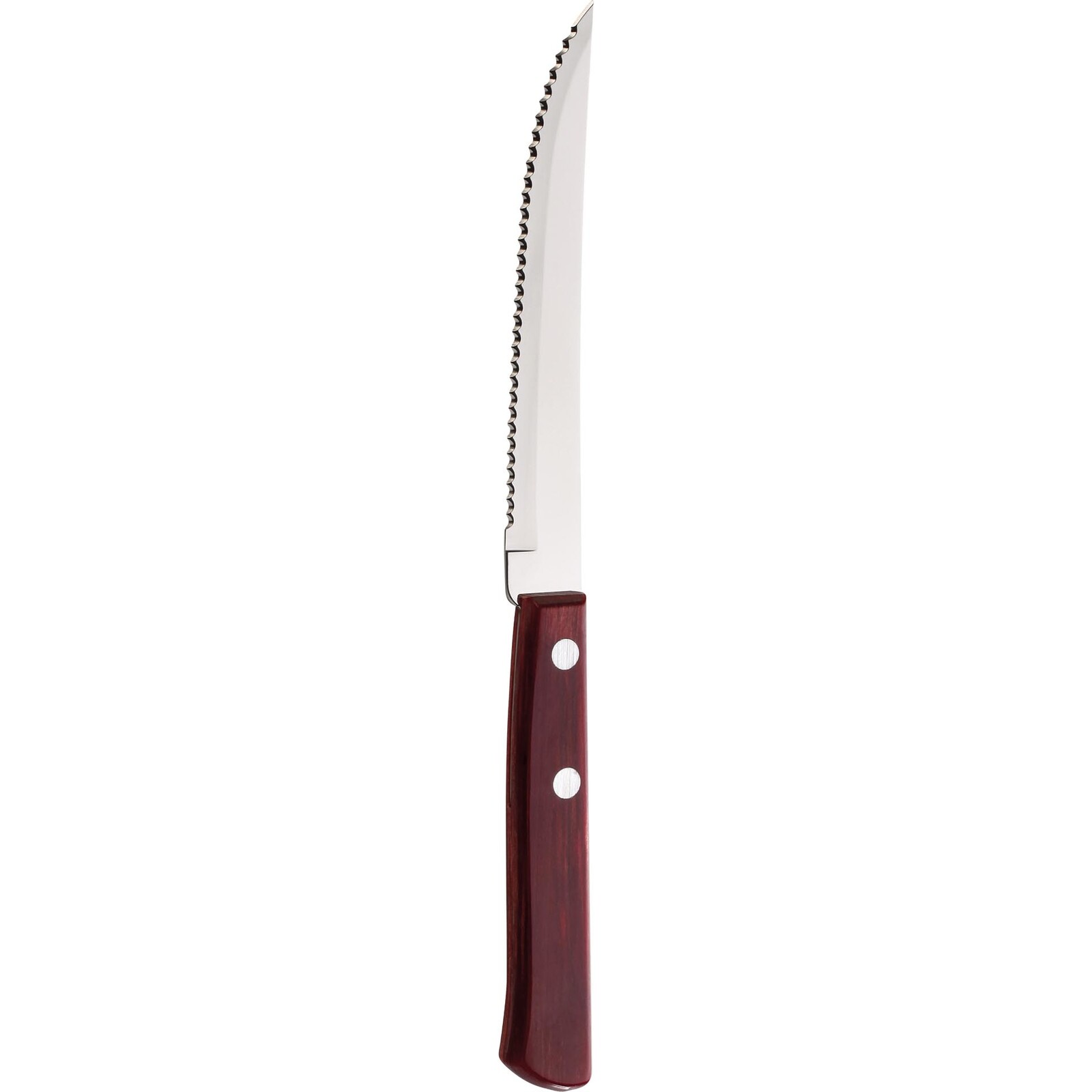 Der Holzgriff (Kiefernholz) wird in feinen Schichten mit Harz imprägniert, unter Hitzeeinfluss gepresst, zugeschnitten und poliert. Dadurch werden die Holzschichten und Poren des Holzes fest verschlossen, sodass keine Feuchtigkeit eindringt und der Holzgriff spülmaschinengeeignet ist. Edelstahl-Nieten garantieren eine sichere Fixierung von Griff und Klinge. Die extra scharfe und widerstandsfähige Schneide gewährleistet beste Schneideeigenschaften. Klinge aus rostfreiem Edelstahl AISI 420 und Gabel aus AISI 430. 5 Jahre Garantie.