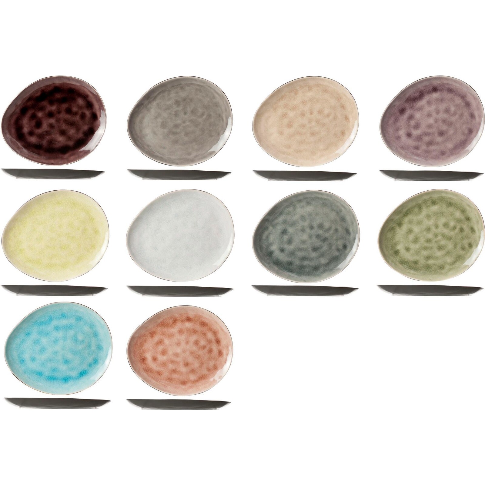 Steinzeug, in 10 verschiedenen Farben. Farbe changiert. Innen glänzend, außen schwarz matt. Jedes Teil individuell. Farbig sortiert. Im 10er Set. Spülmaschinengeeignet.