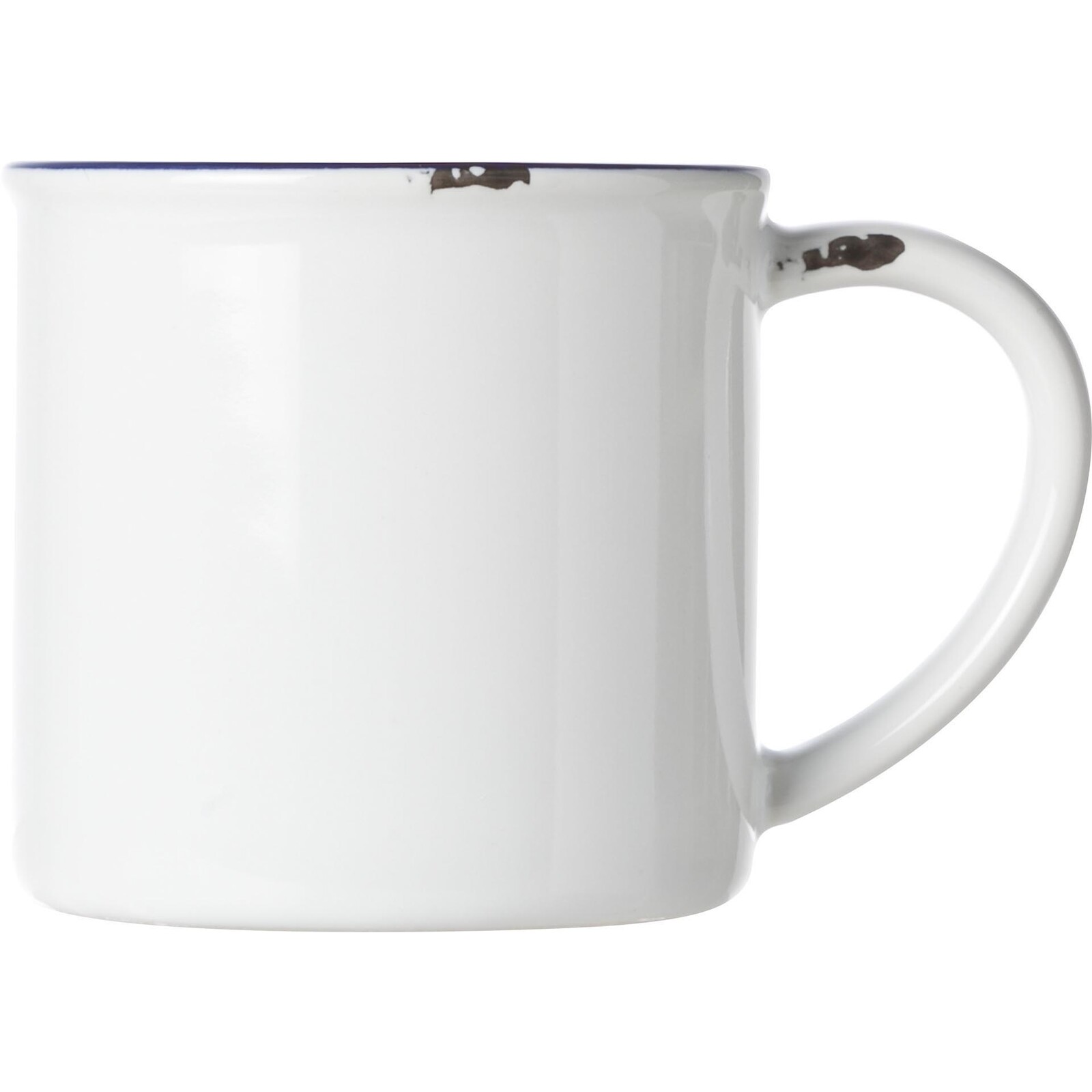 Steinzeug im Vintage-Look, weiß mit blauem Rand und optisch abgeschlagenen Ecken und Kanten in schwarz. Spülmaschinengeeignet.