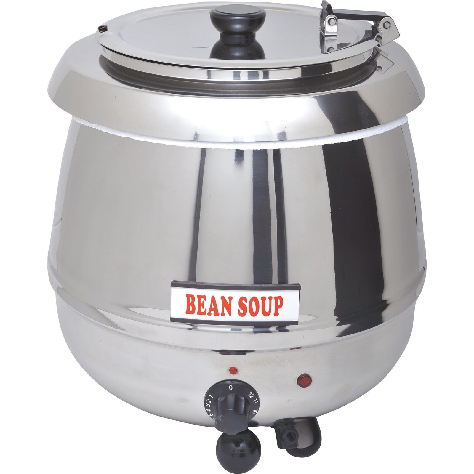 Edelstahl, Einsatztopf (herausnehmbar) mit dreh- und klappbarem Edelstahldeckel 18/10. Löffelaussparung, hitzeisoliertem Griff, inkl. 14 magnetisch haftender Suppenbeschriftungen (D/E). Regelthermostat von 30°C bis 95°C.