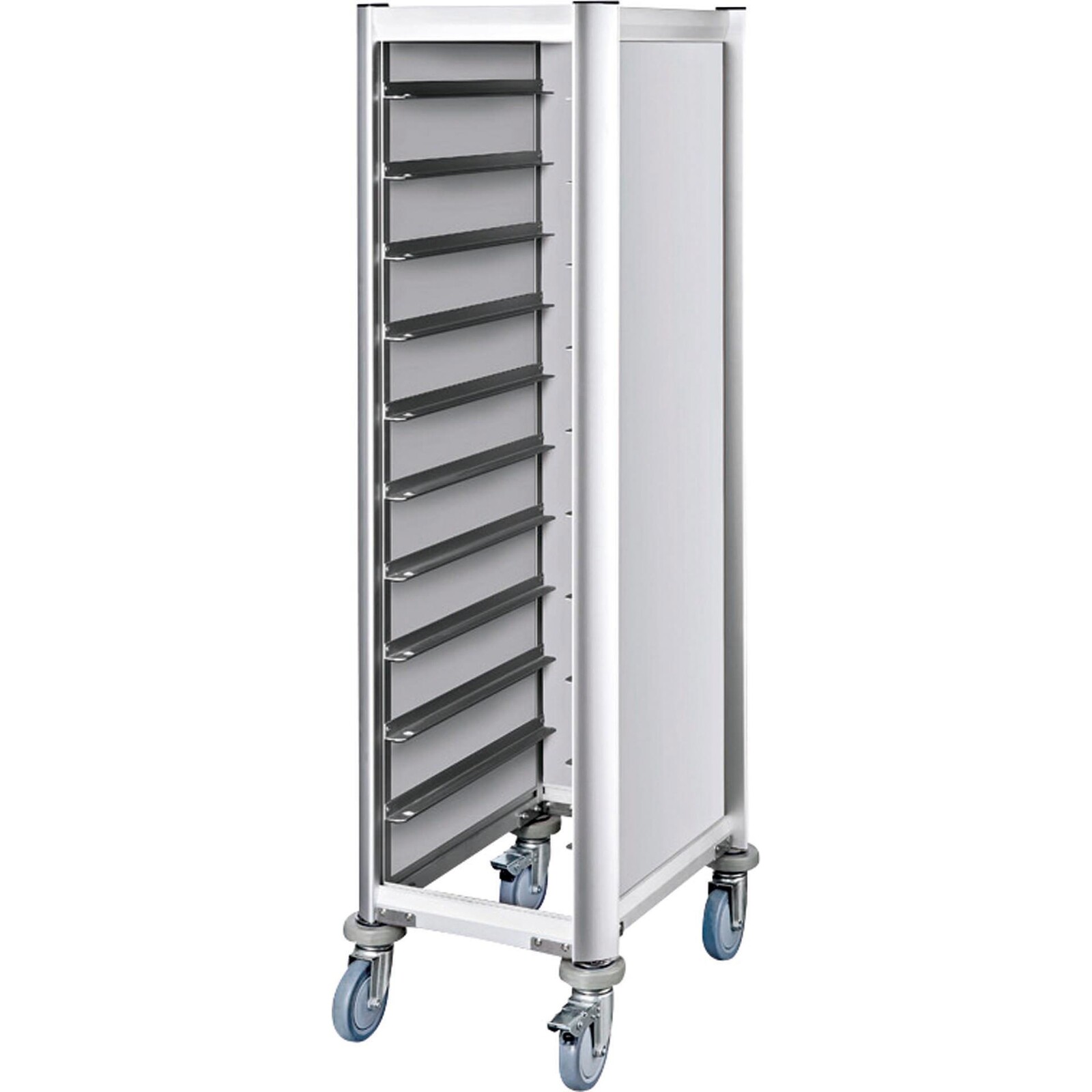 Alu-Profile mit MDF-Platten Dekor Alu. Für Tabletts 1/1 GN. 4 Lenkräder Ø 12,5cm, 2 Räder mit Bremse.
