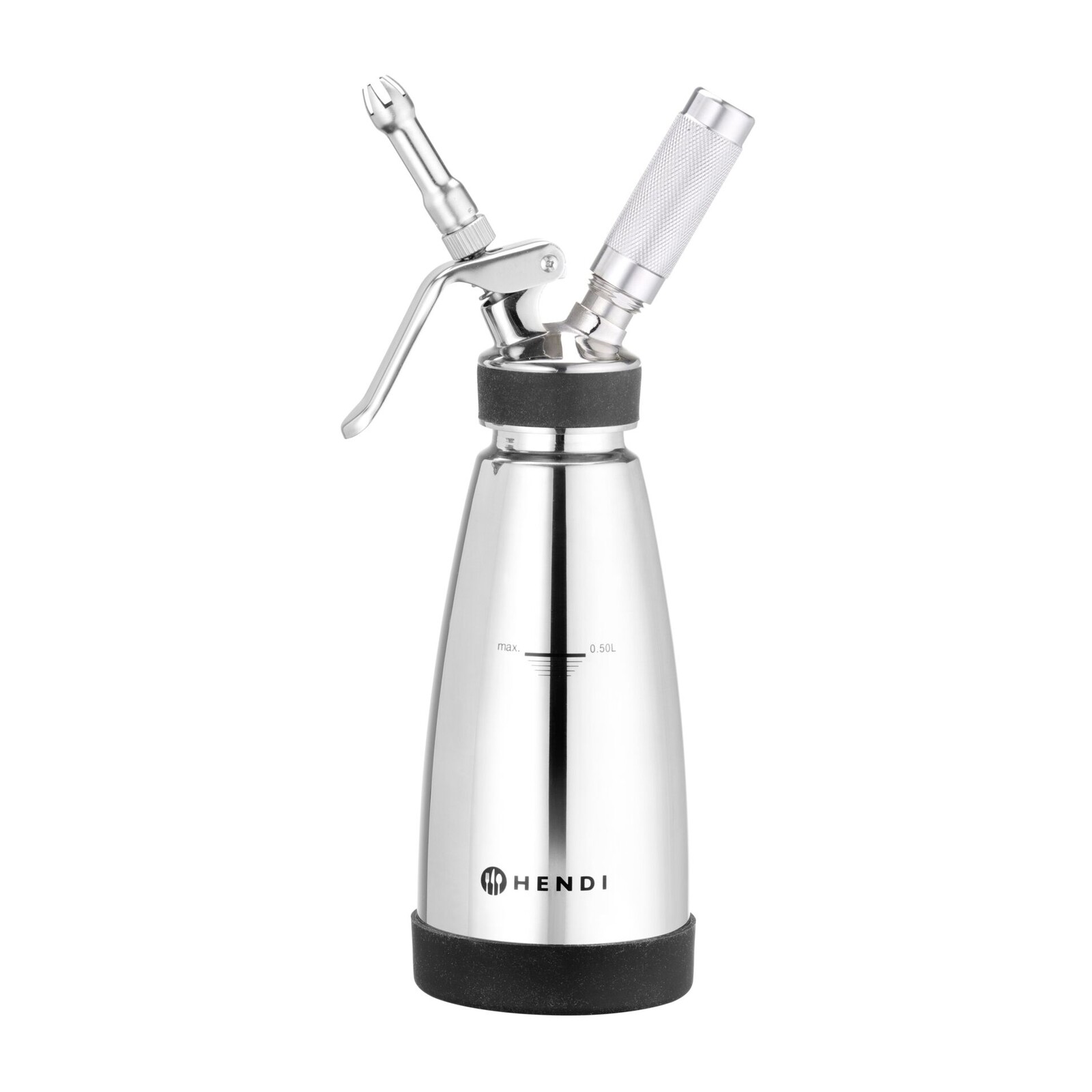 Aus doppelwandigem Edelstahl. Rutschfester Basisring aus Silikon. Siphon eignet sich sowohl für heiße als auch für kalte Saucen. Enthält 3 verschiedene Edelstahldüsen, eine Gaskappe und eine Reinigungsbürste. Für Geschirrspüler geeignet.