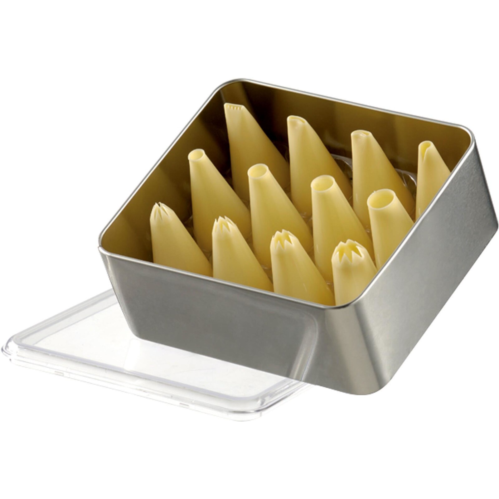 12-teilig. PP. Elfenbeinfarben. Höhe: 6 cm. Set bestehend aus 4 Sterntüllen (Gr.3,5,7,9), 4 Lochtüllen (5,7,9,11), 4 Garniertüllen (Grattülle, Rosentülle, Sternbandtülle links und rechts) und Box.