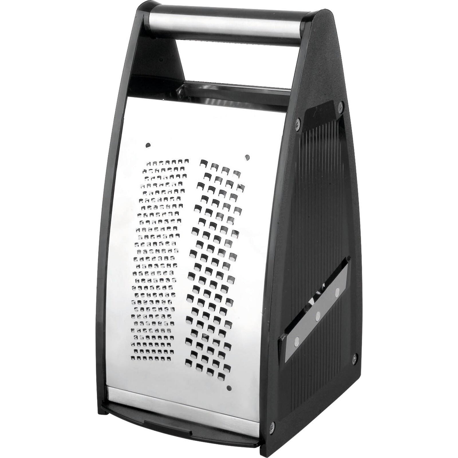 Edelstahl, Kunststoff, schwarz. Mit Griff. Vier Seiten mit verschiedenen Reiben. Spülmaschinengeeignet.